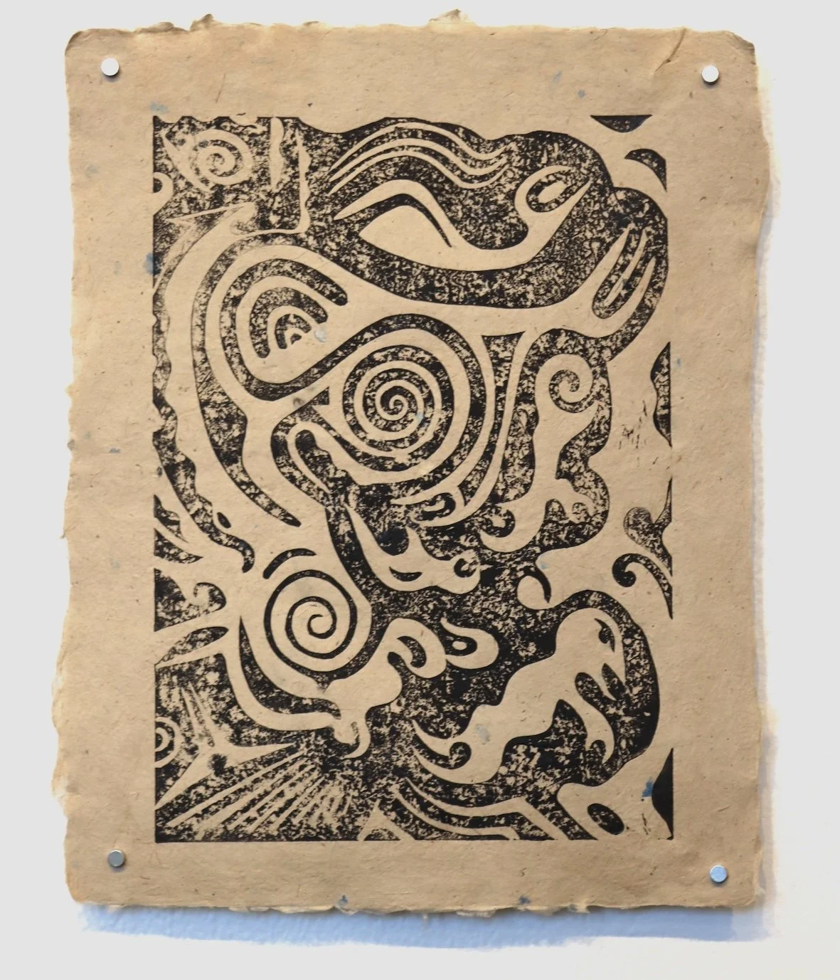 Medium - Woodblock print on harakeke paper, printed with harakeke seed pods