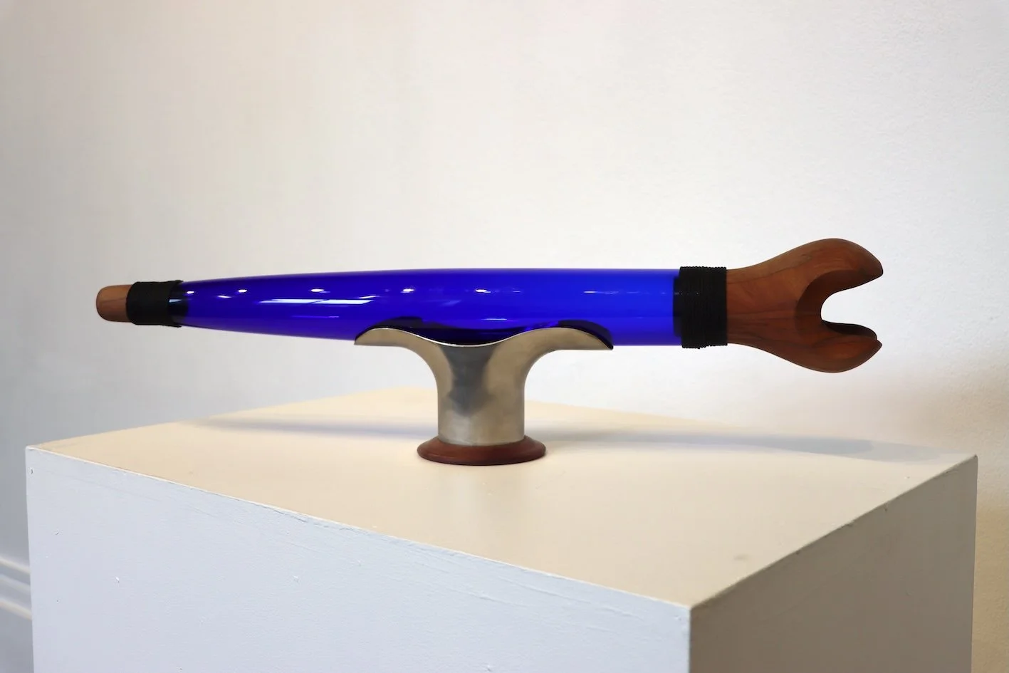 Description - Pūkāea II is based on the Māori traditional wind instrument the trumpet. They were used to send messages to neighbouring villages with some messages being heard many miles away. Over 10 years ago I pursued glass as a medium and with taonga puoro, I wanted to compare the sound of wood, to the sound of glass. This work is an extension of that pursuit. There were six other artists who helped create this work at the CollaboratioNZ Whangārei event earlier this year. I’ve been attending Collabs around the world for over 10 years and working with others to create art, has opened my eyes to the endless opportunities with my creativity.