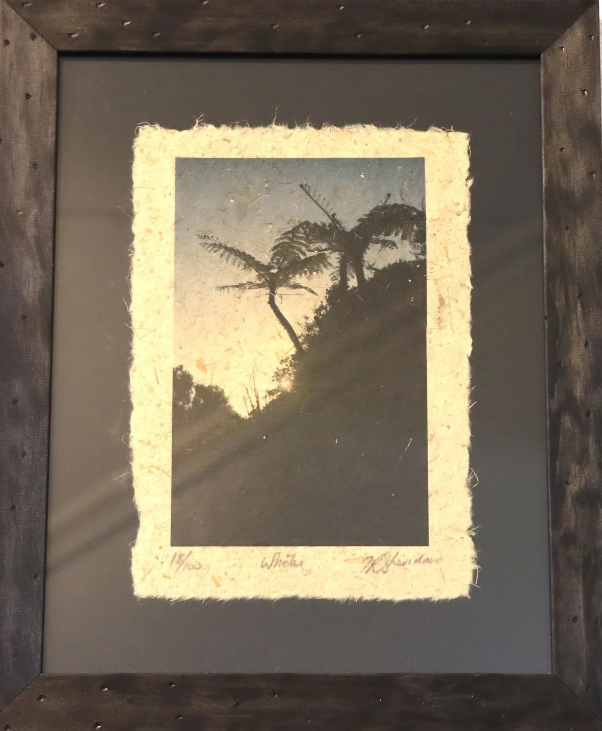 Description - Driving through Mōkau, a small coastal town in the King Country looking back toward Taranaki maunga, this crop of whekī trees were silhouetted by the setting sun. Printed on harakeke paper by Harete.