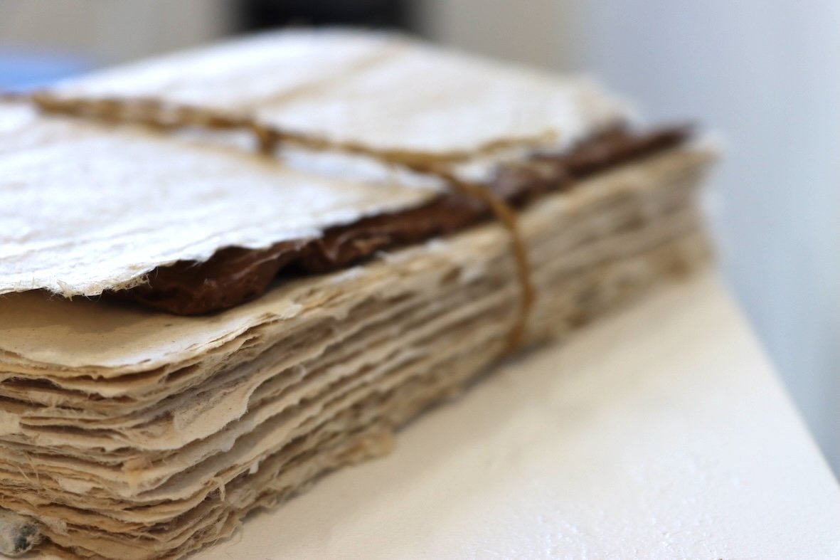 Medium - Handmade Pukapuka - pages handmade from a variety of plants including harakeke, cedar bark, cattail, abaca, cotton, spruce, bound with wax thread & muka dyed with raurekau - 25 leaves, 50 pages.